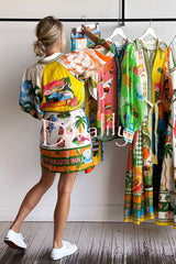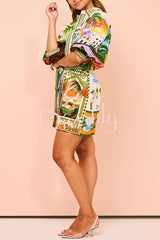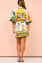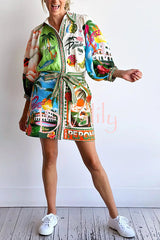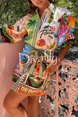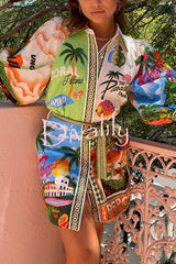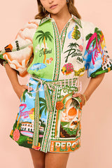 Summer sophistication linen blend unique print belted pocket shirt mini dress