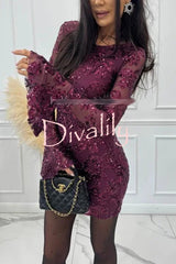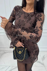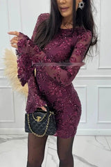 Deep and dazzling floral texture sequin long bell sleeve open back mini dress