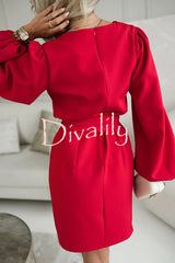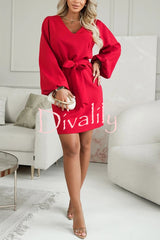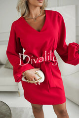 Holiday gatherings v-neck long balloon sleeve tie-up waist loose mini dress