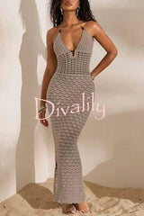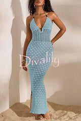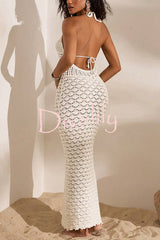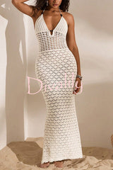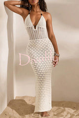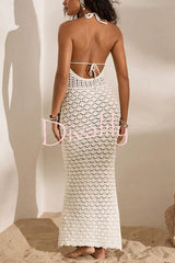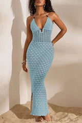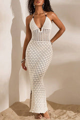 Solid color openwork halter neck slim-fit knitted cover-up maxi dress