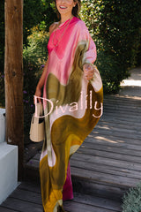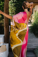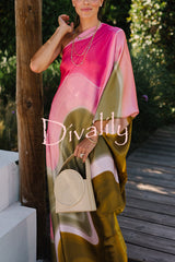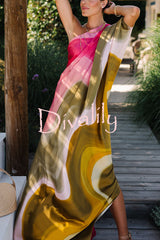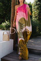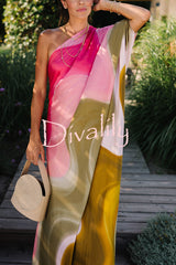 Summertime favorites satin tie dye print one shoulder drape vacation maxi dress