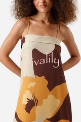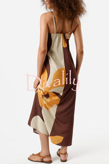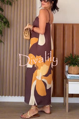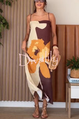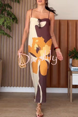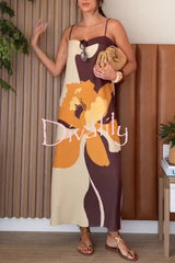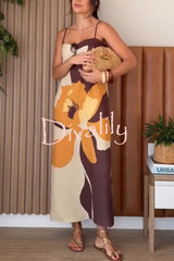 Light breeze color-block floral print adjustable strap h-line midi dress