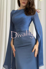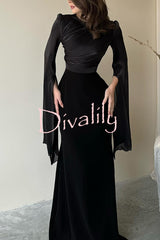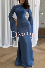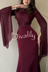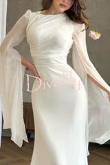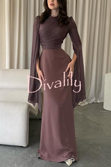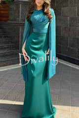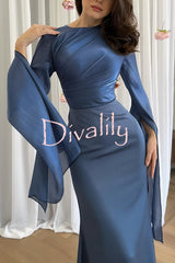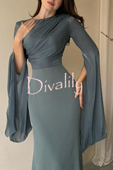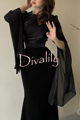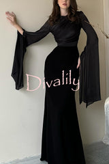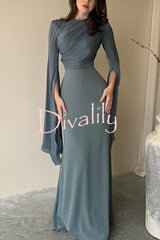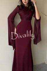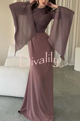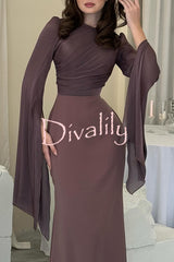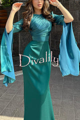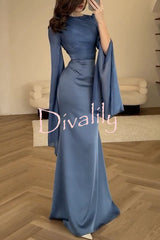 Liora ruched organza and satin patchwork design long bell slit sleeve maxi dress