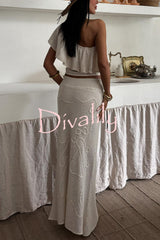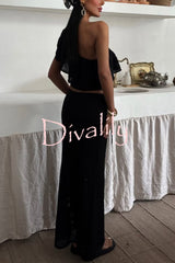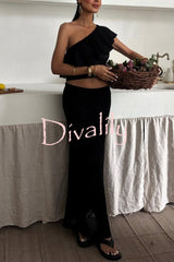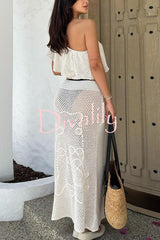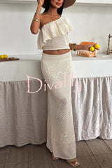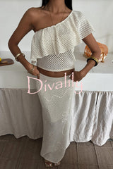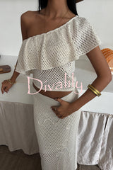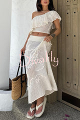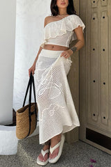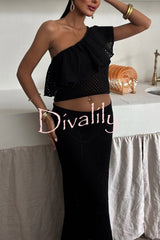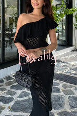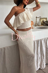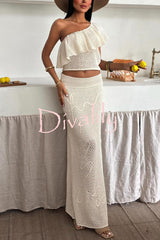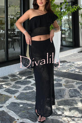 Solid color one-shoulder ruffled openwork top and elastic waist holiday knit maxi skirt cover-up set