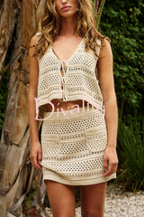 Solid color v-neck openwork tie-waist top and elastic waist pocket holiday knit mini skirt cover-up set
