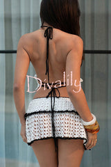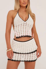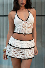 Stylish color-blocked openwork knit top and stretch mini skirt cover-up set