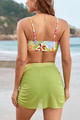 Floral print mesh pleated elastic two-piece bikini swimsuit