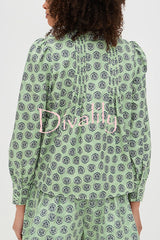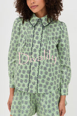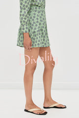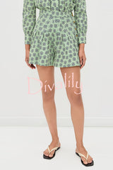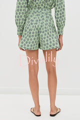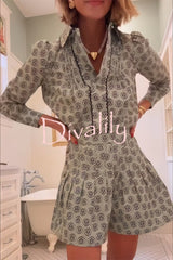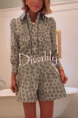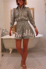Deelia unique print scalloped edges long sleeve blouse and pleated button waist flare shorts set