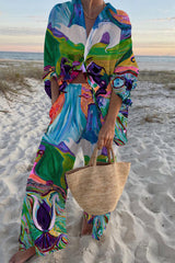 Abstract oil painting print oversized shirt and elastic waist pocket pants set