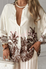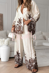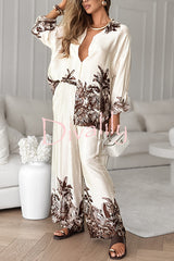 Botanical print loose long-sleeved shirt and elastic waist pocket casual wide-leg pants