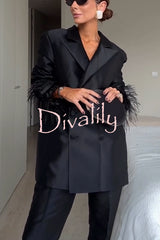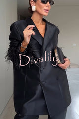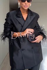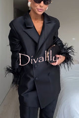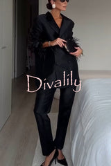 Chic affair satin feather trim lapel loose blazer and high rise pocket tapered pants set