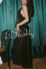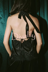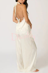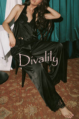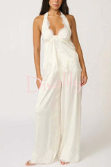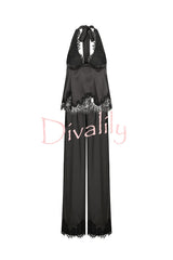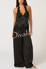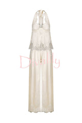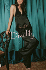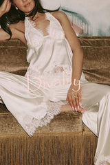 Elegant morning satin lace trim halter tie-up tank and elastic waist loose pants set