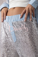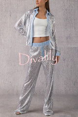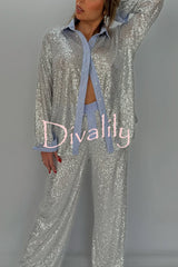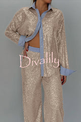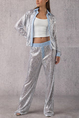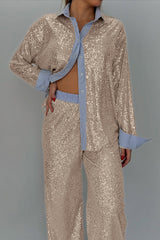 Fashion sequined loose long-sleeved shirt and casual elastic waist wide-leg pants set