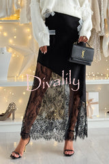 Gentle winter satin lace patchwork high rise elastic waist maxi skirt