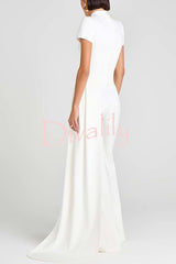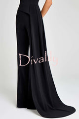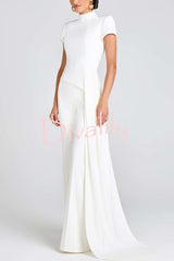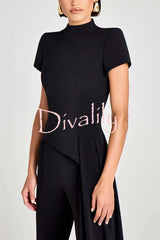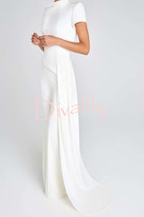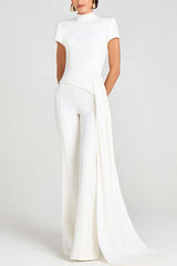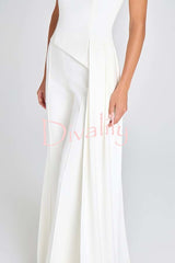 - This asymmetrical top is crafted from an exclusive white crepe fabric and paired with curved, draped, floor-length pants. It features a high neckline, structured padded shoulders, and short sleeves for a sharp silhouette. A hidden zipper closure at the back ensures a comfortable fit.Our distinctive clothing will add instant style to your wardrobe.
