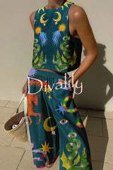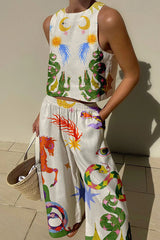 Island dreaming linen blend unique print tank and elastic waist pocketed pants set