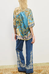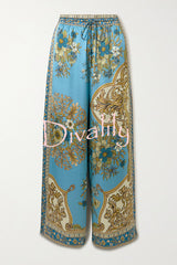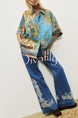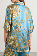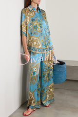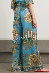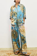 Satin floral print loose shirt and elastic waist pocket casual wide-leg pants