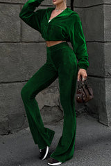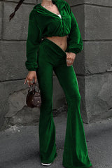 Solid color velvet casual hooded zip-up top and elastic waist flared pants set