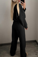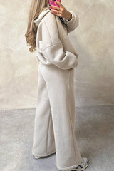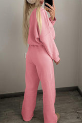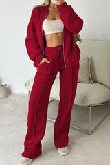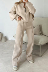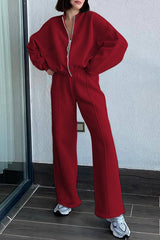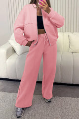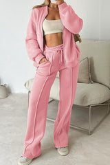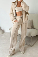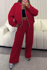 Solid color long-sleeved zip-up sports jacket and casual elastic waist pocket pants set
