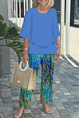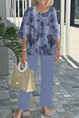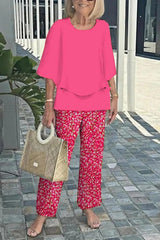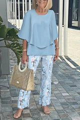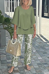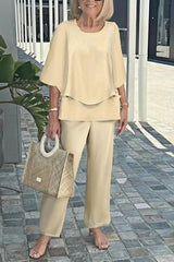 Fashion round neck half sleeve loose top and elastic waist casual straight pants set