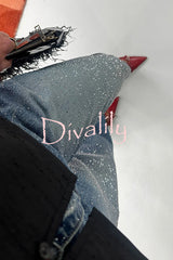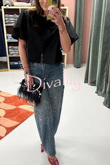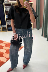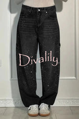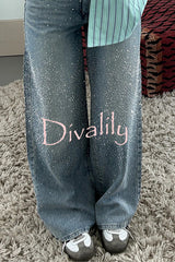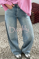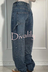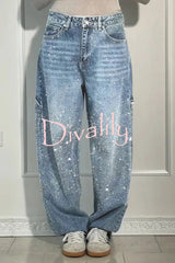 Fashionable rhinestone mid-rise loose pocket straight jeans