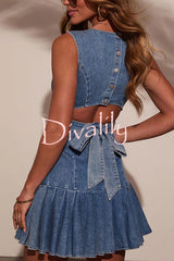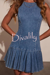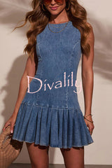 Fashionable spliced back hollow lace-up pleated slim-fit denim mini dress