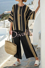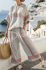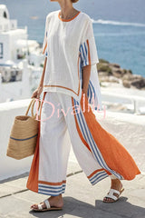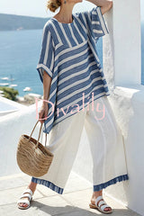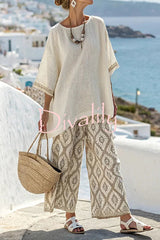 Linen blend unique print half sleeve top and elastic waist pocket loose pants set