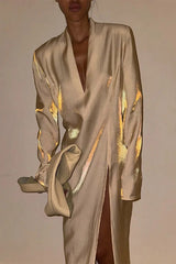 Solid color glossy v-neck long sleeve casual slit maxi dress