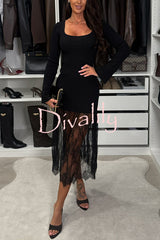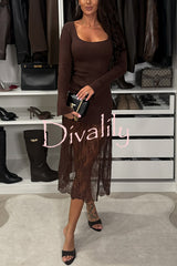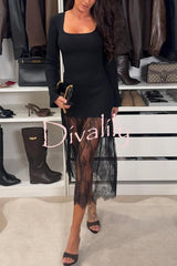 Ellie ribbed knit square neck long sleeve lace patchwork hem midi dress
