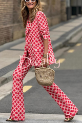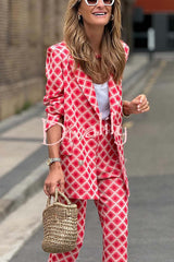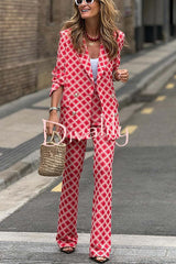 Chic lady unique print metal button pocketed lapel blazer and elastic waist flare pants set