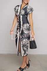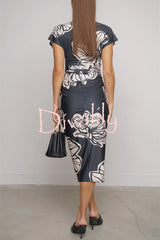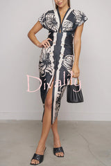 Bella contrast color unique print dolman sleeve ruched slit midi dress