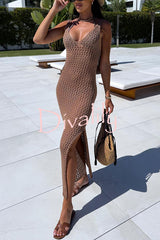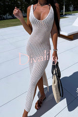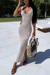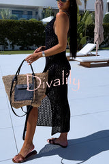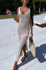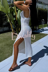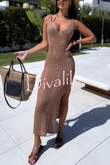 Solid color v-neck hollow beach knitted cover-up midi dress