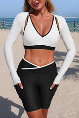 Stylish v-neck pocketed stretch two-piece bikini swimsuit and solid color long-sleeved cover-up set