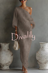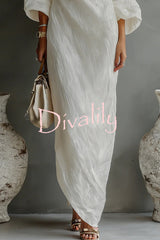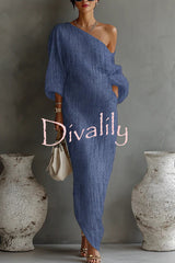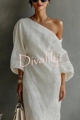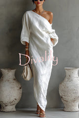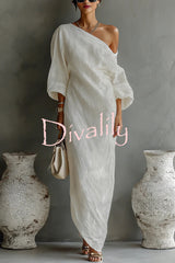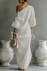 Linen blend loose-fitting one-shoulder lantern sleeve casual pocket maxi dress