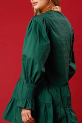 - Visions of sugar-plums dance in your head with this festive dress! A pink, blue, white, and gold colored sequined nutcracker design - A sequined collared neckline that goes into a buttoned front - Long, loose sleeves with smocked ruffle cuffs - Hidden side pockets - A flowy silhouette that ends in a mini dress length hemline.