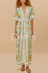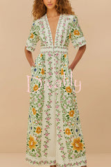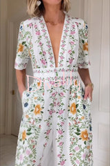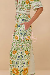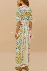 Natural charm linen blend floral print short sleeve pocketed wide leg jumpsuit