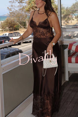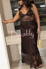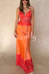 Elegant evening satin lace patchwork see-through waist slip maxi dress
