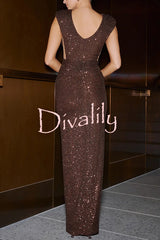 Party season sequin deep v-neck metal buckle ruched waist front slit maxi dress