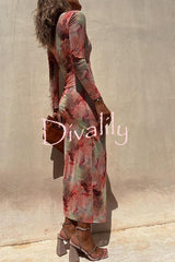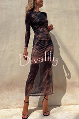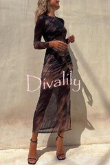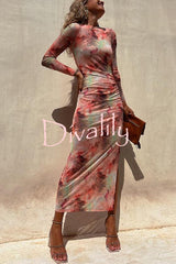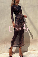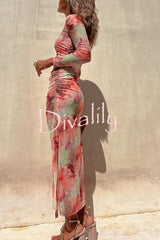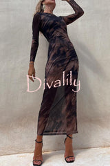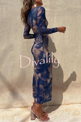 Charm lady mesh overlay tie dye print long sleeve ruched stretch midi dress