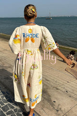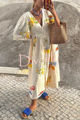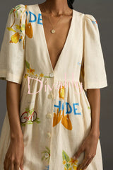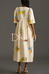 Cozy summer linen blend unique print button puff sleeve loose midi dress