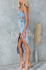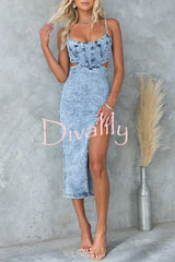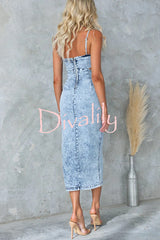 Felicia washed denim princess seams cutout waist back zipper stretch midi dress