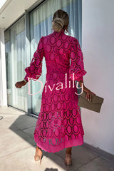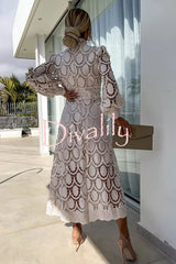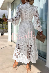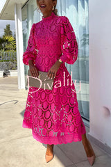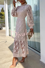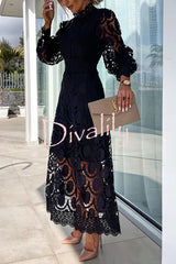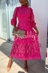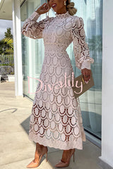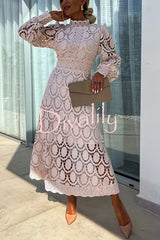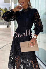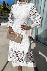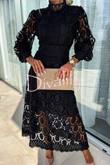 Romantic, sensual and elegant crochet lace lantern sleeve party midi dress