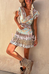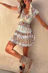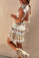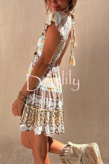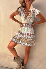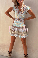Surat unique color block print ruffle sleeve elastic waist backless mini dress