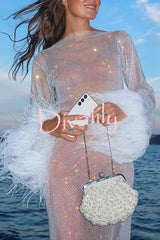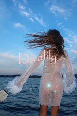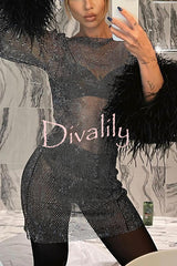 - Mini dress with wide sleeves, complemented by an ostrich feather. Made of open knit fabric with rhinestone embellishments throughout.