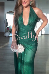 Edeita sequin pleated design deep halter u-neck slit drape gown maxi dress