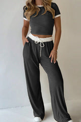 Fashionable round neck short-sleeved top and elastic waist pocket casual straight pants set