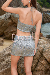 Fashionable sequined fitted halter top and holiday slit mini skirt cover-up set