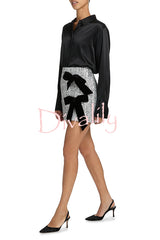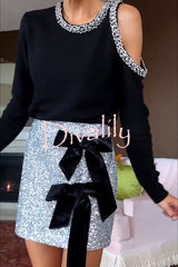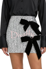 Holiday party sequin velvet bow detail high rise stretch mini skirt