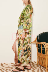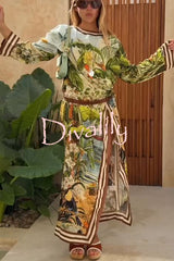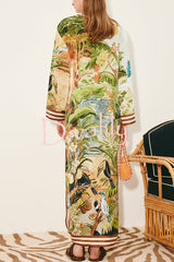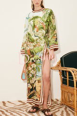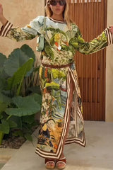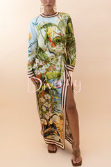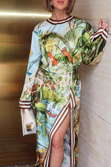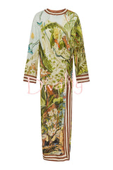 Jungle scenery unique print long sleeve side-slit h-line maxi dress