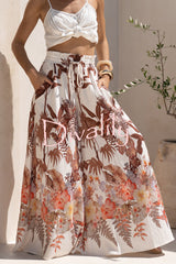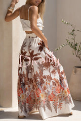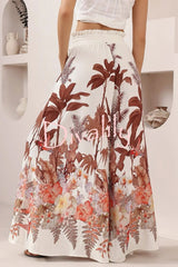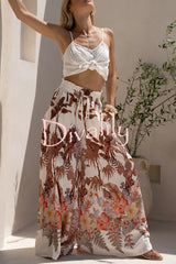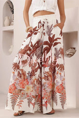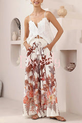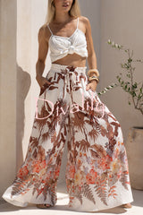 Leaf print casual elastic waist pocket loose wide-leg pants